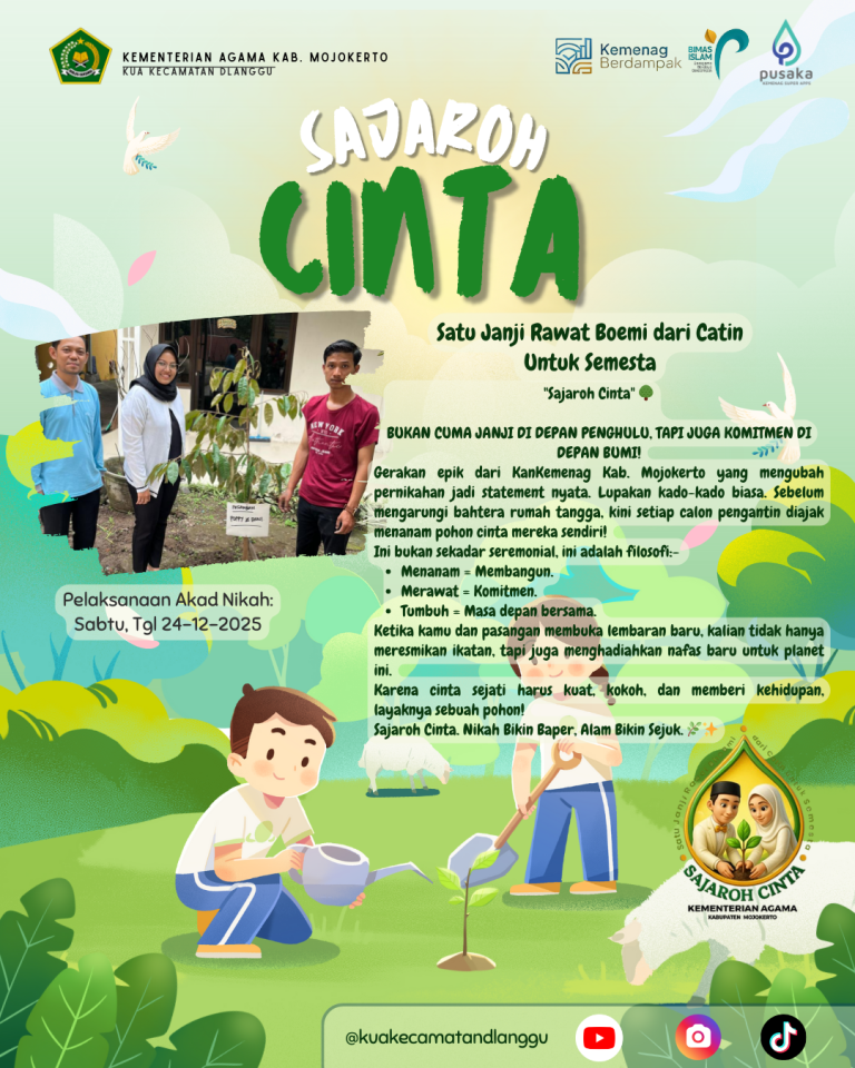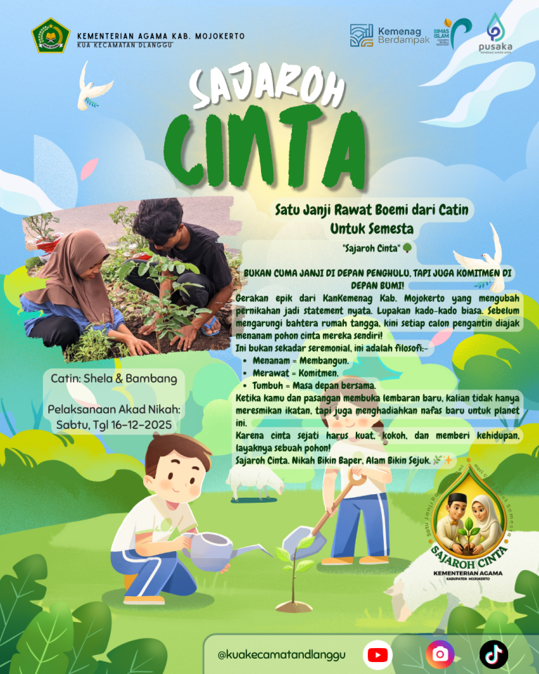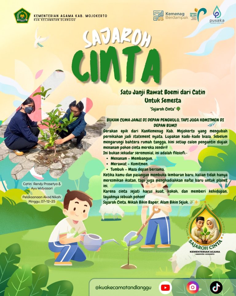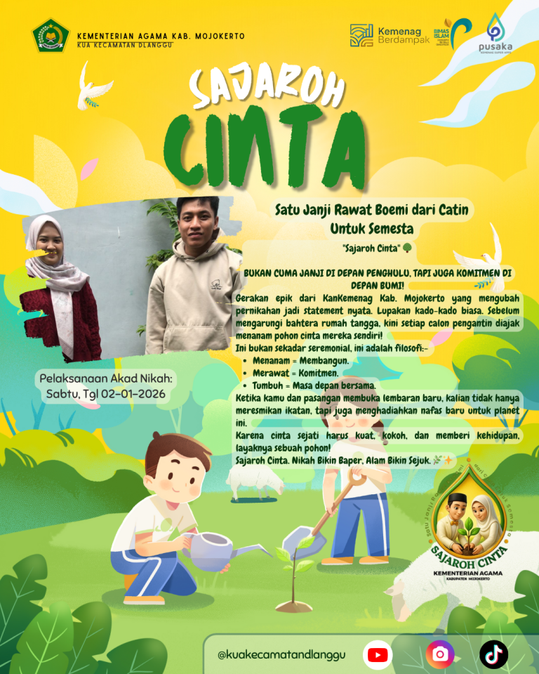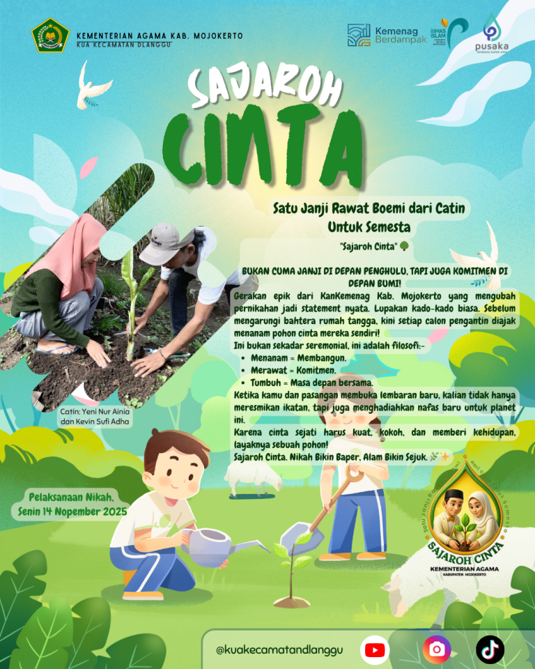 Gerakan epik dari KanKemenag Kab. Mojokerto yang mengubah pernikahan jadi statement nyata. Lupakan kado-kado biasa. Sebelum mengarungi bahtera rumah tangga, kini setiap calon pengantin diajak menanam pohon cinta mereka sendiri!