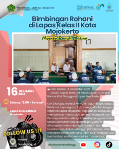“Agama adalah lentera yang tak boleh padam, bahkan di tempat yang paling terbatas sekalipun. Pada Selasa, 16 Desember 2025, KUA Dlanggu melalui Penyuluh Agama Islam, Bpk. Bagus Rokhmat Jayanegara, S.HI., hadir di Lapas Kelas II B Kota Mojokerto untuk melaksanakan program Bimbingan Rohani.