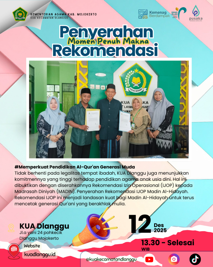 Pendidikan Qurβani, Generasi Berbakti! β¨ KUA Kecamatan Dlanggu terus berkomitmen mendukung kemajuan pendidikan agama di wilayah Dlanggu. Hal ini dibuktikan dengan penyerahan Rekomendasi Izin Operasional (IJOP) kepada Madin Al-Hidayah pada 12 Desember 2025 kemarin. Langkah ini adalah upaya bersama untuk memperkuat legalitas lembaga pendidikan keagamaan, agar Madin Al-Hidayah semakin kokoh dalam mencetak generasi muda yang berakhlak mulia dan cinta Al-Qur'an. ππ π KUA Dlanggu, Jl. A. Yani No. 24, Pohkecik. π kuadlanggu.id #KemenagBerdampak #KUADlanggu #MadinAlHidayah #IJOP #PendidikanAgama #Mojokerto #GenerasiQurani