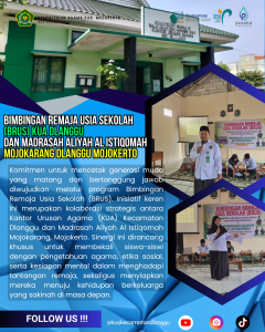 Mempersiapkan Generasi Tangguh sejak Dini Masa remaja adalah fase krusial menuju kehidupan berkeluarga yang sakinah. Melalui program Bimbingan Remaja Usia Sekolah (BRUS), KUA Dlanggu menjalin kolaborasi strategis dengan Madrasah Aliyah Al Istiqomah, Mojokarang. Di sini, para siswa tidak hanya diajarkan pengetahuan agama, tetapi juga etika sosial dan kesiapan mental guna menghadapi tantangan remaja di era modern.